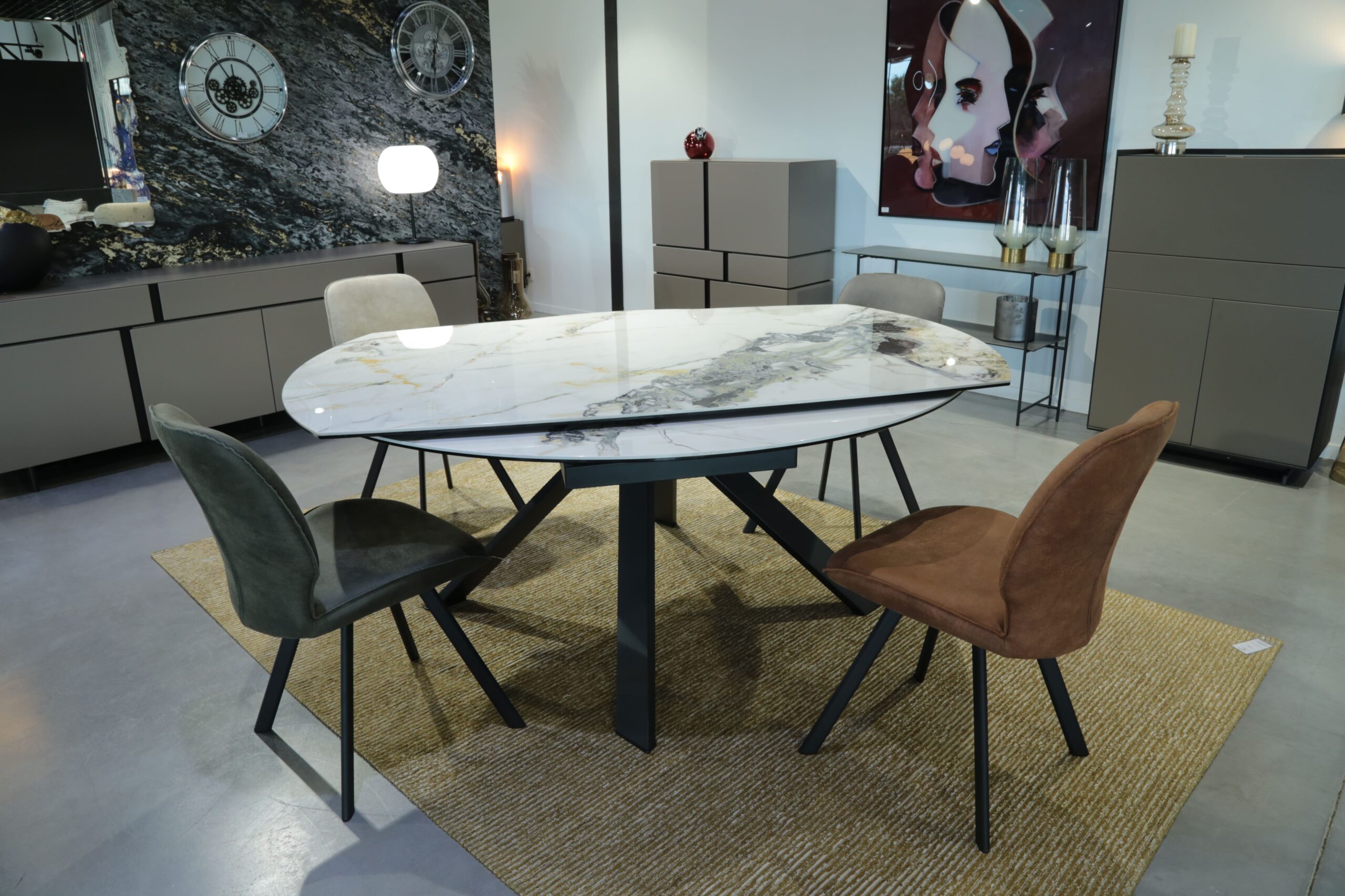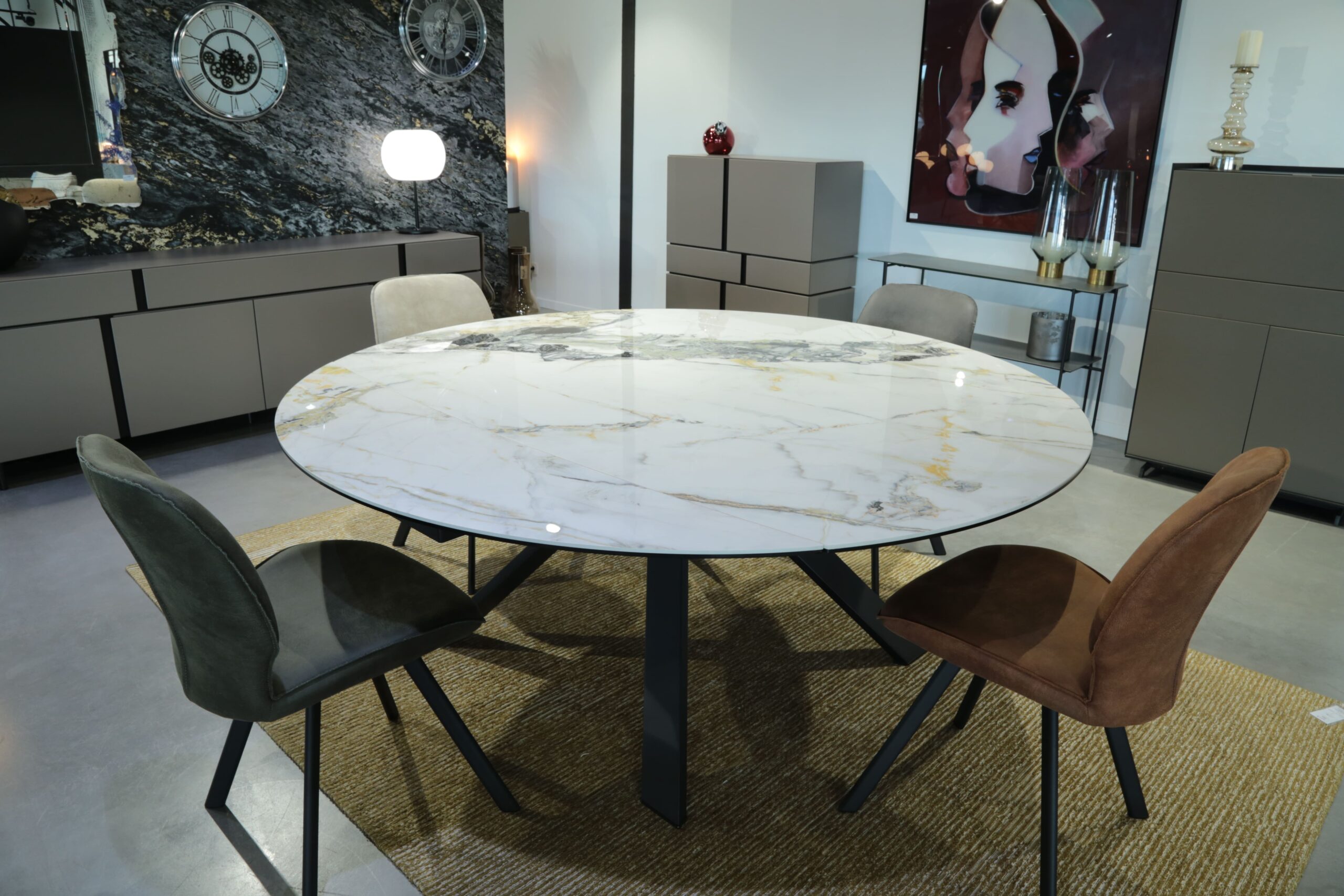 Table conviviale et extensible. Passe d’un simple geste d’un plateau format tonneau à un plateau rond.