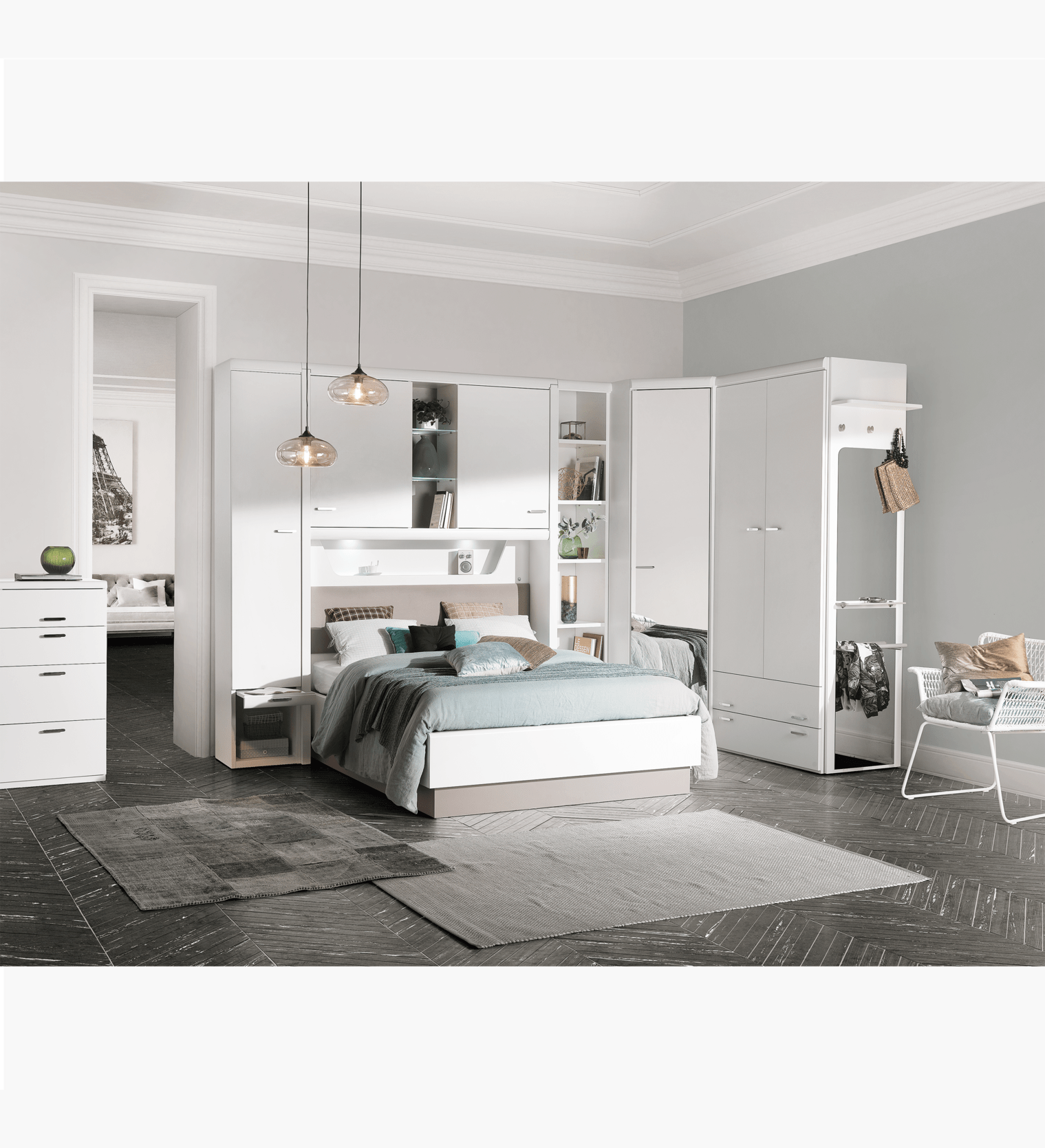 Dans la même collection : lits, chevets, commode, pantalonnière, semainier, armoires de rangement personnalisables, à portes battantes ou coulissantes, compositions d’angle, pont de lit. Choix de dimensions et de finitions.