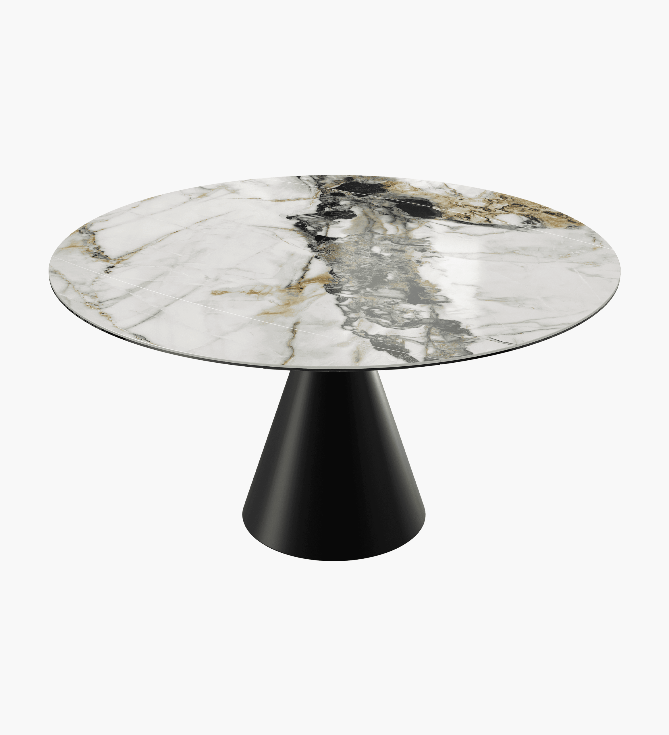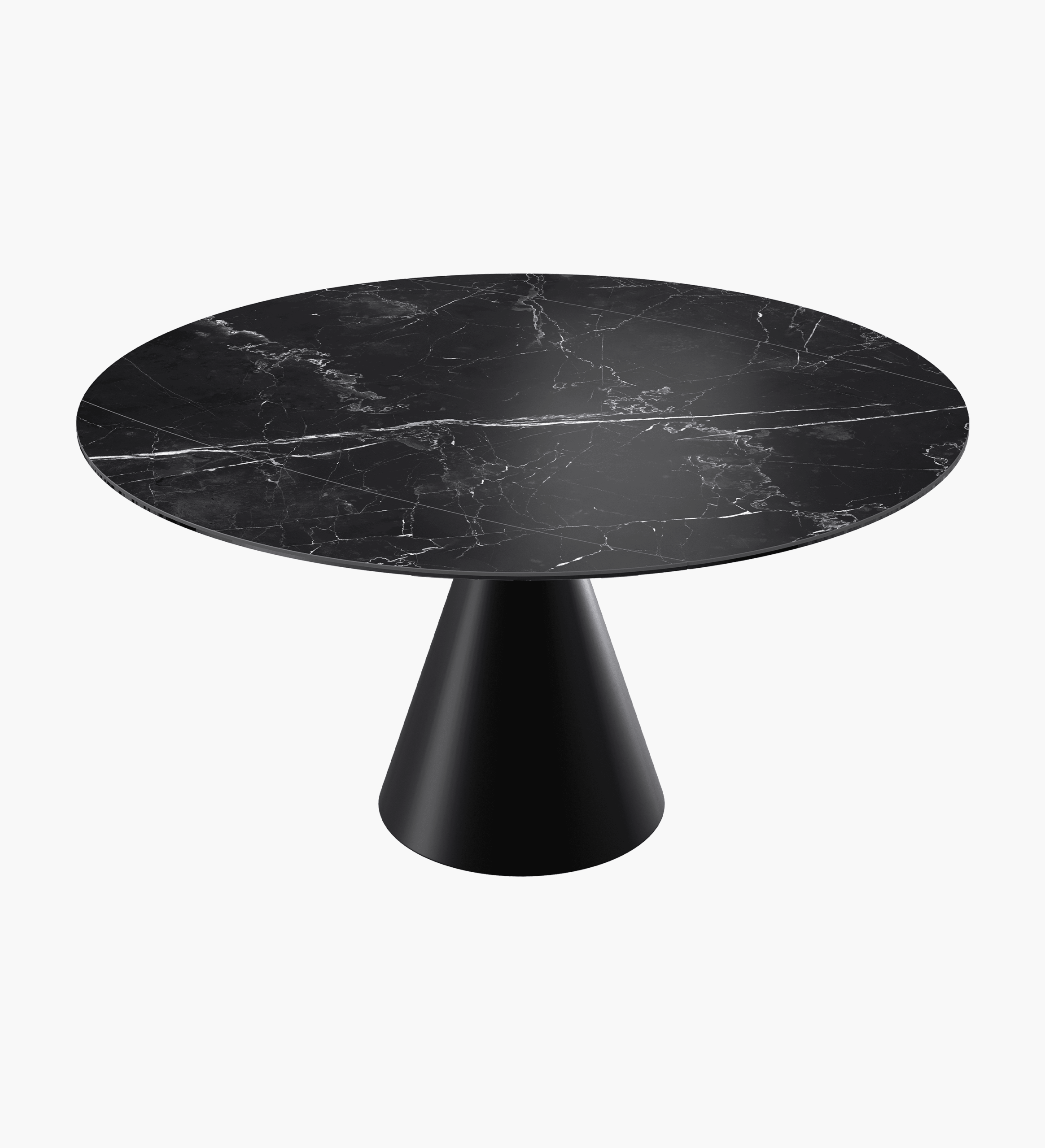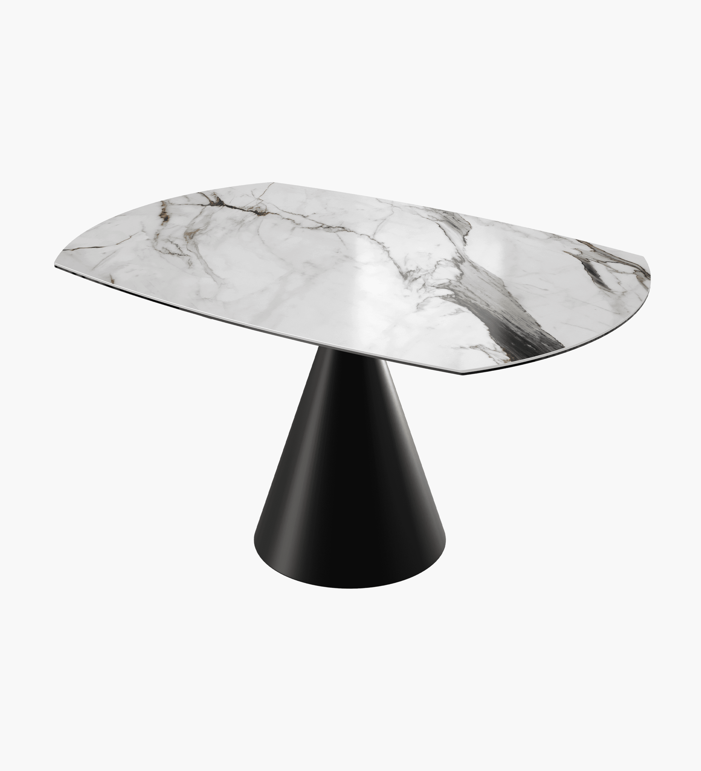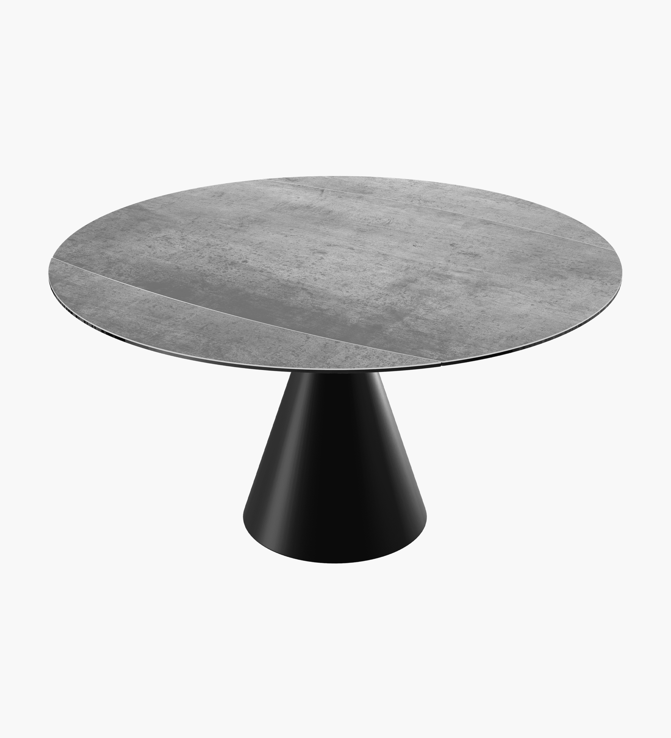 Table contemporaine conviviale et extensible. Passe aisément d’un plateau format tonneau à un plateau rond. Se distingue par l’originalité de son piètement en forme conique.
