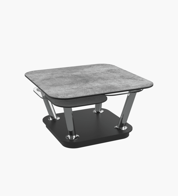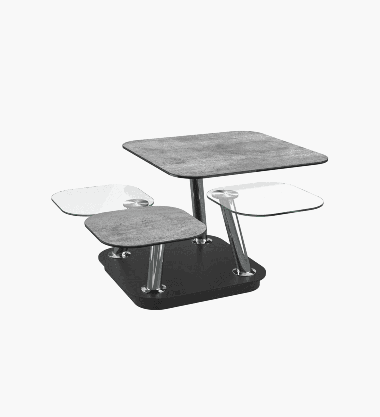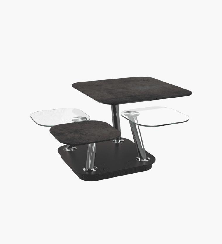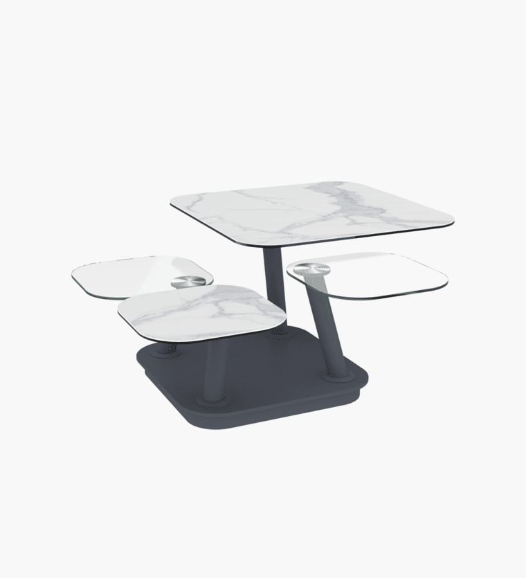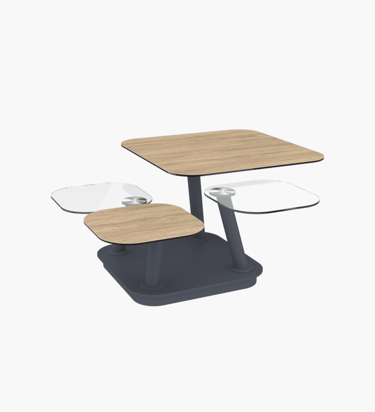 Table basse avec 4 plateaux pivotants se déployant de manière synchronisée.