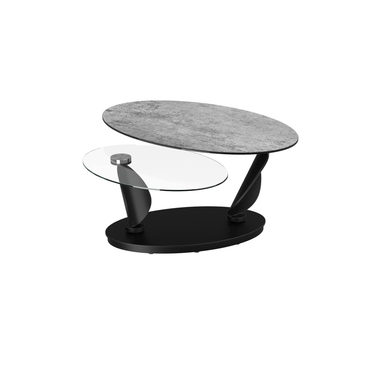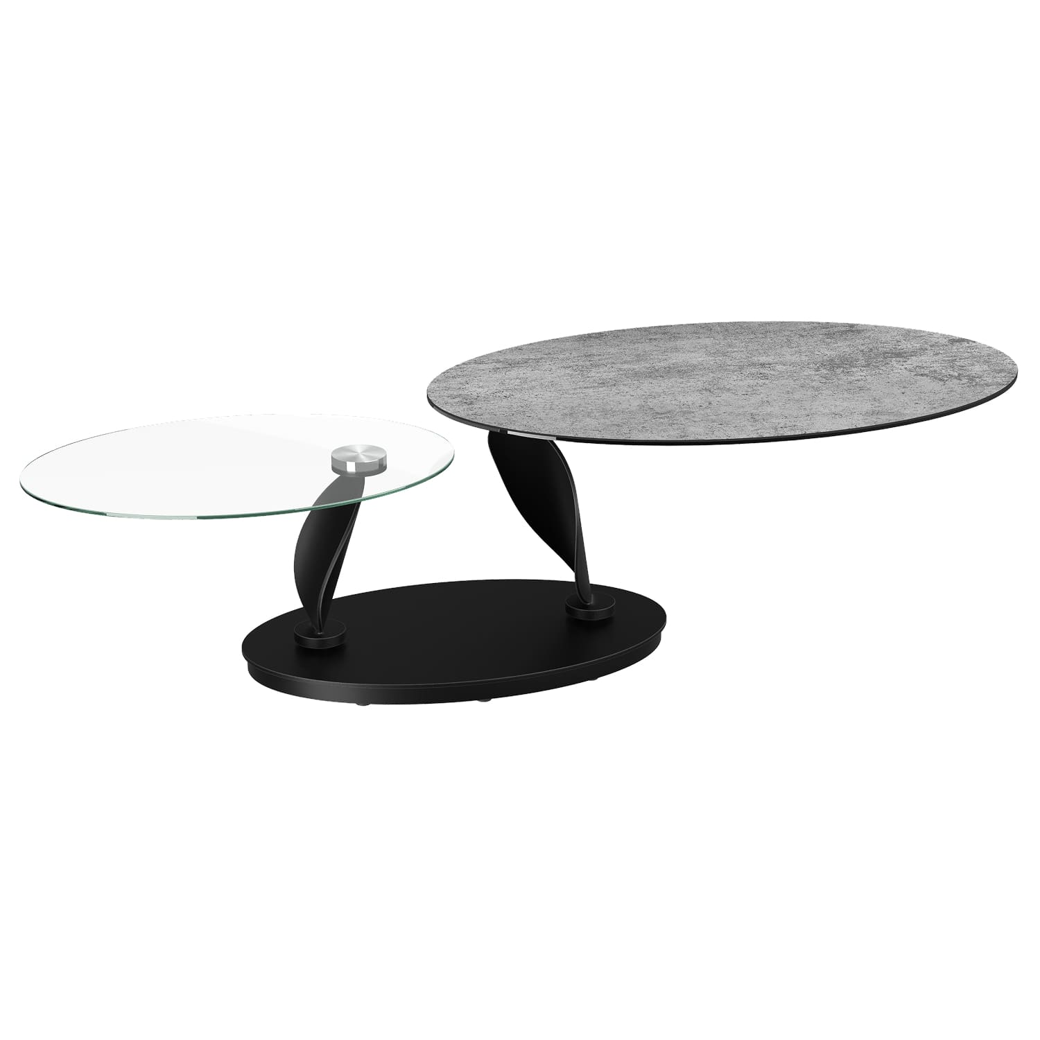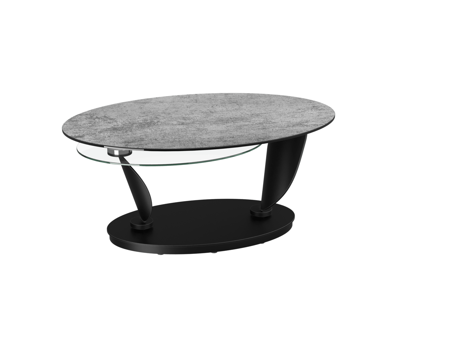 Plateaux verre ou céramique, avec choix de teintes de céramique. Piètement en acier laqué noir ou taupe.