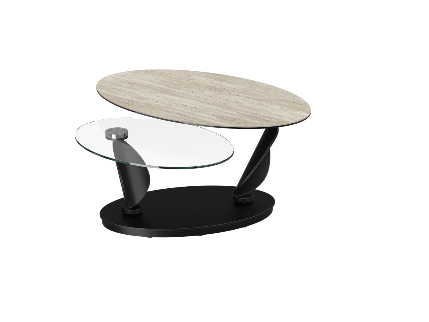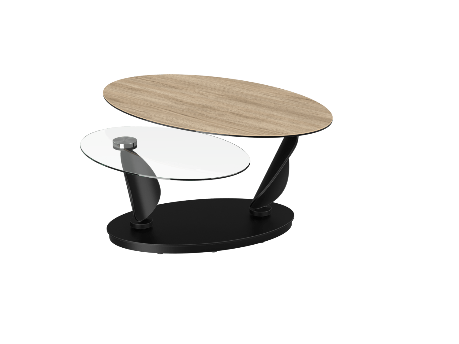 Table basse dotée d’un mécanisme pivotant à 360° permettant le déploiement de ses 2 plateaux. Avec ou sans roulettes.