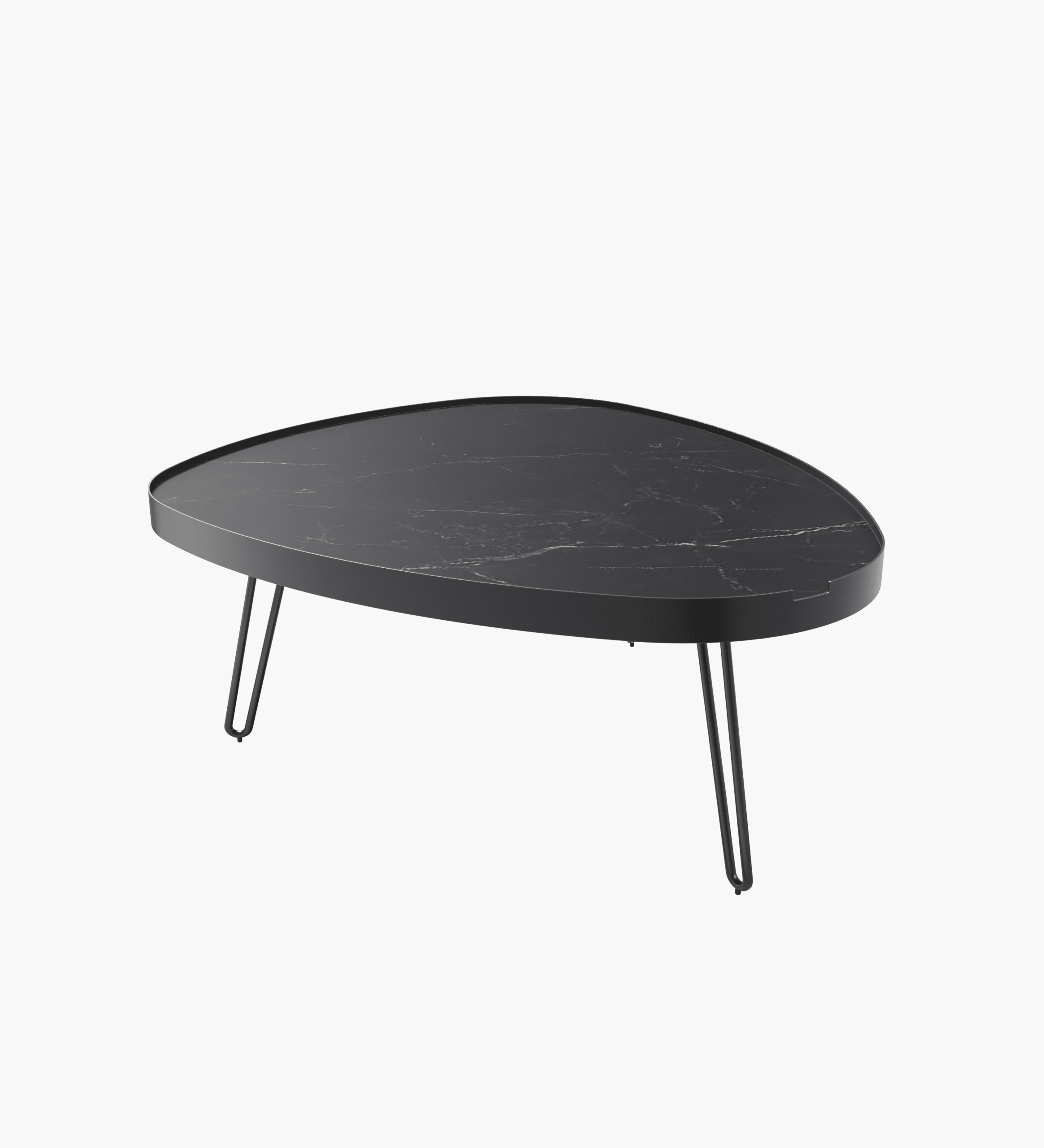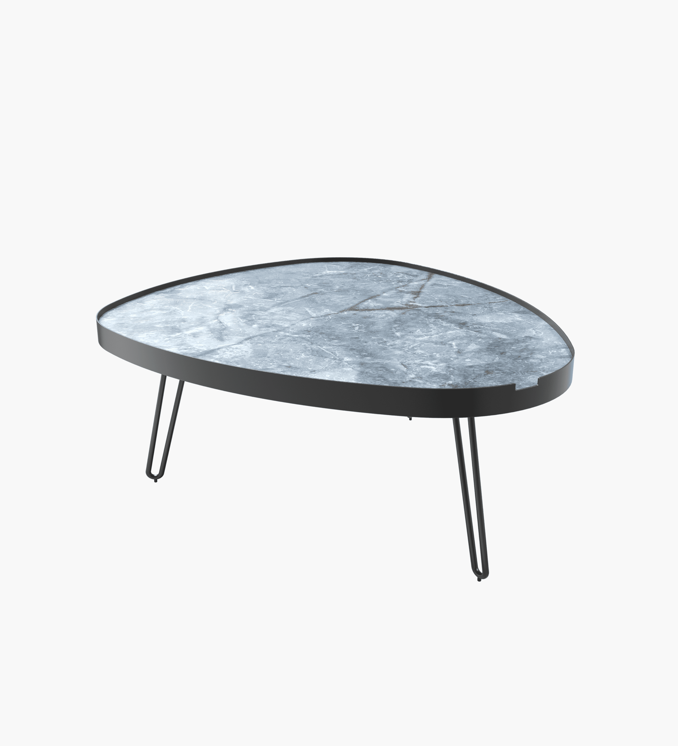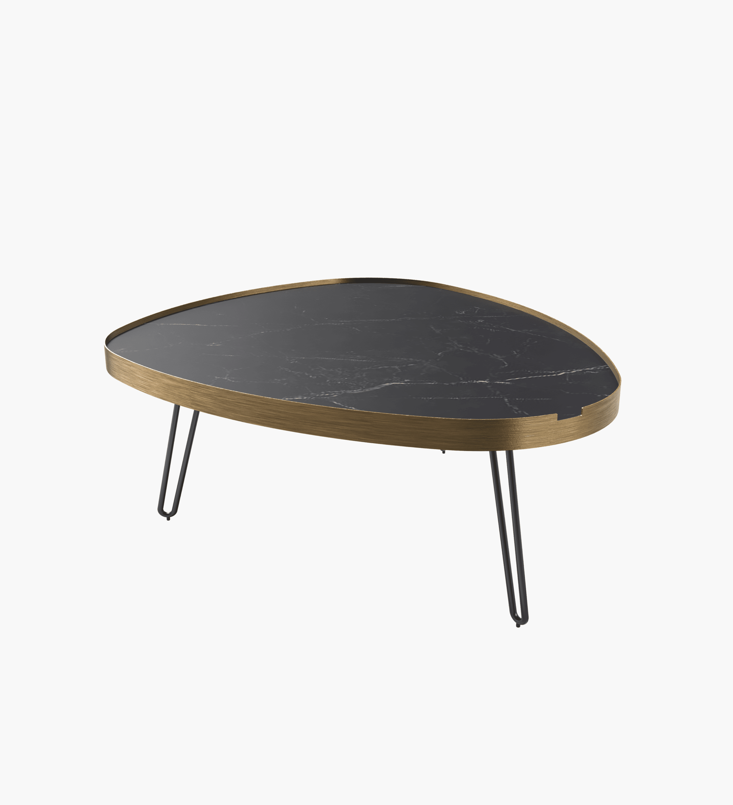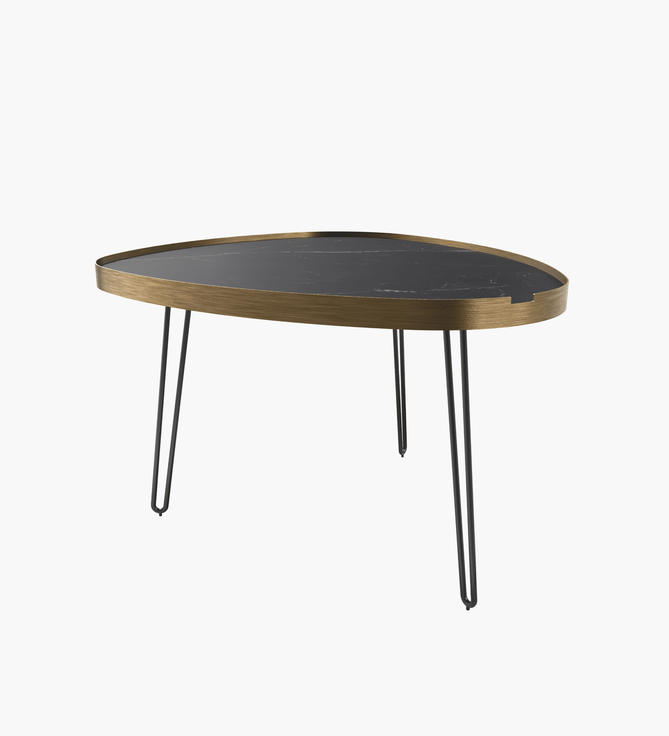 Table basse personnalisable, ornée d’une ceinture en acier noire ou effet bronze. Existe en plusieurs dimensions.